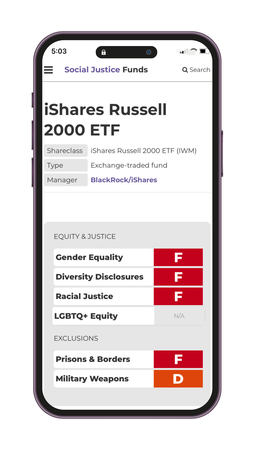 Check to see if your investments are aligned with social justice. Use your investment list from step 1 to find your fund grades. You can search for mutual funds and exchange-traded funds (ETFs) by name, ticker, or asset manager. Our database covers 5,000 stock funds available in the U.S.